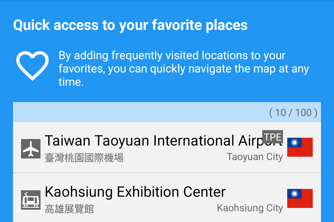 You can register favorites for stations and airports in all countries and regions where “World Transit Maps” provides route maps, as well as your home town. It’s also useful for planning international trips and enjoying virtual trips on your smartphone.